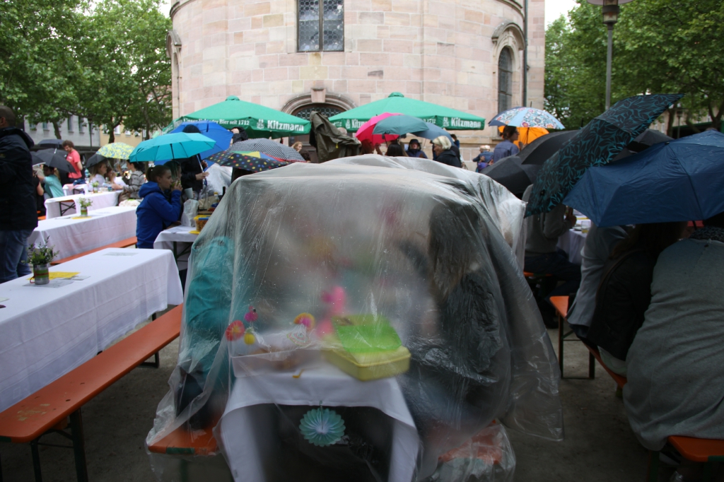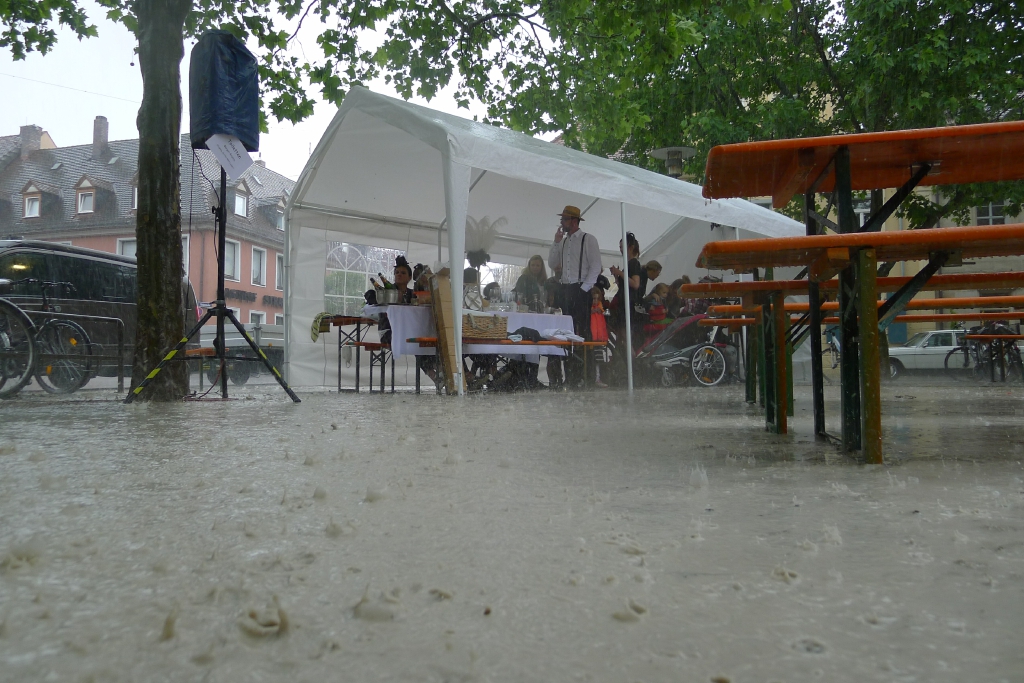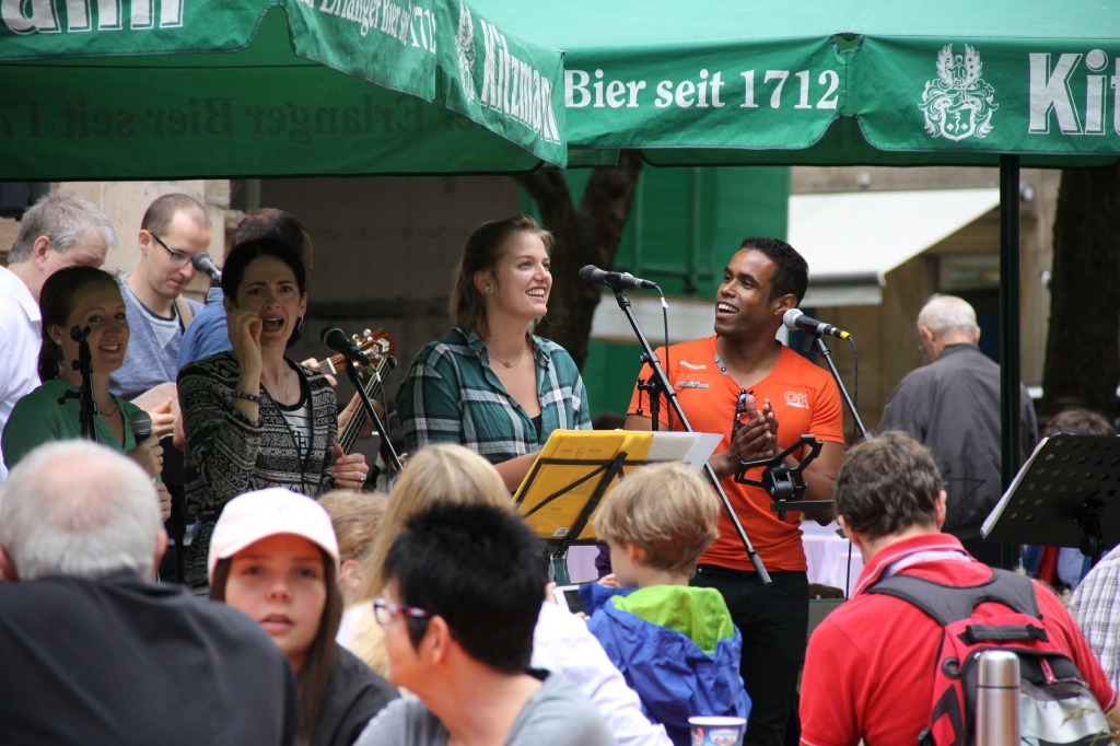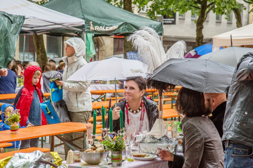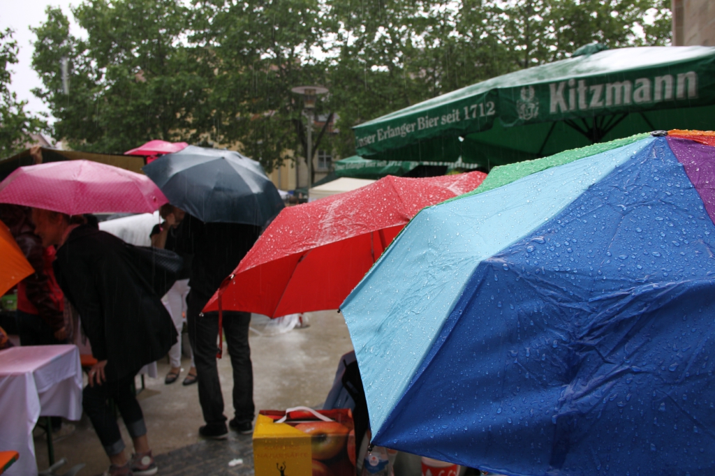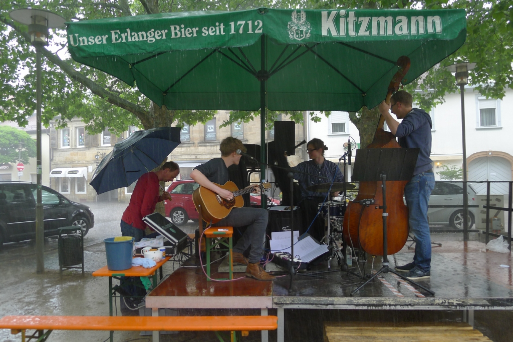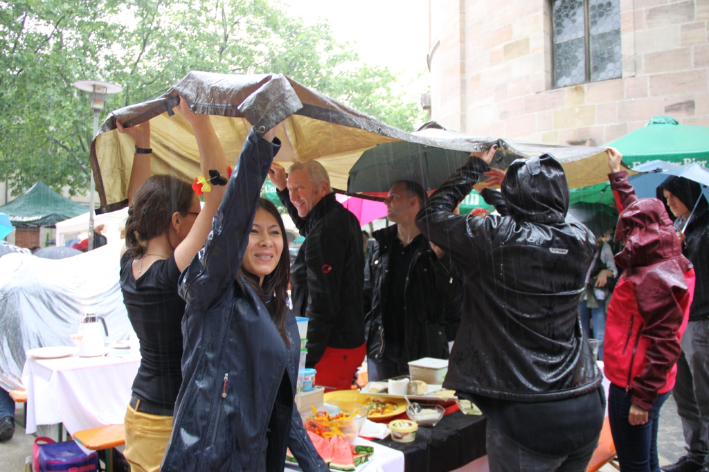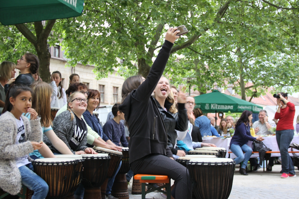 Nach eineinhalb Stunden Sonnenschein hat uns die erste Wolke heimgesucht. Die Trommelpower-Kinder der Hedenus-Mittelschule hatten gerade mit ihrem Auftritt begonnen, als die immer stärker trommelnden Regentropfen sie zum Abbruch zwangen. Dank „wasserfester“ musikalischer Unterhaltung durch die Flüchtlingsband „Miasin zam“ und Gitarrist Felix Käppner mit Band ließen sich aber zahlreiche Gäste auch durch einige weitere Schauer die Stimmung nicht trüben.