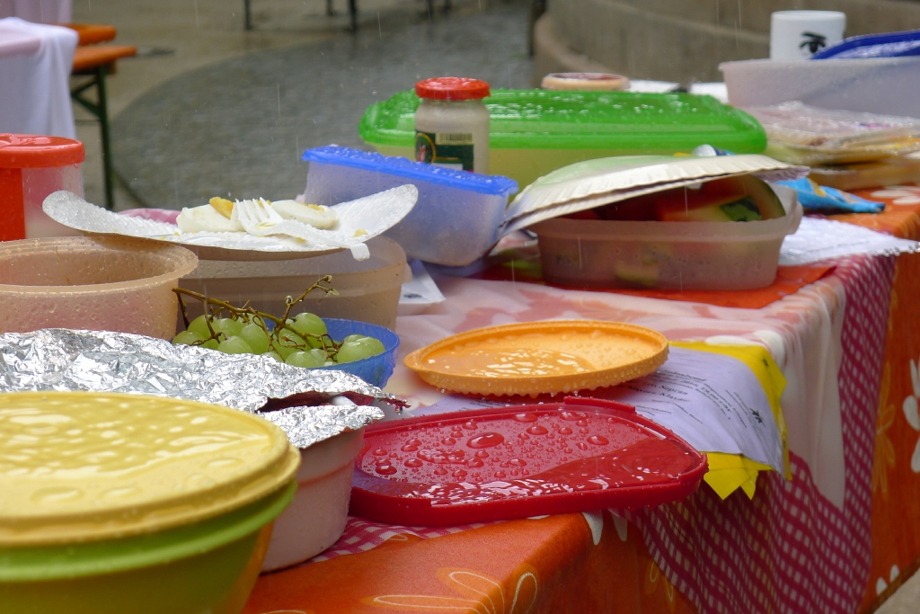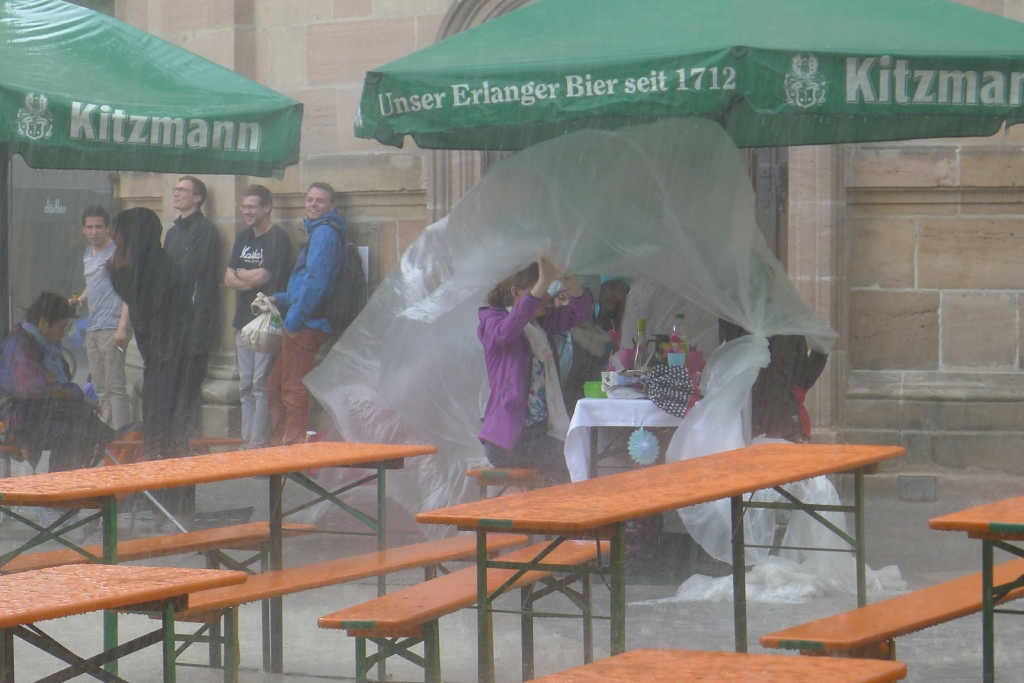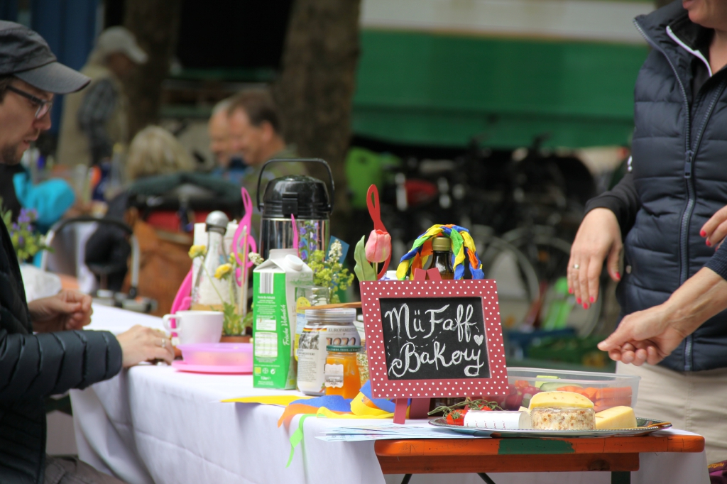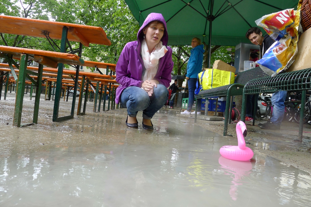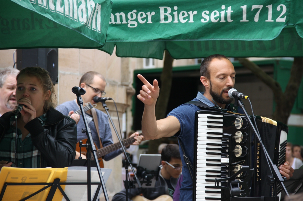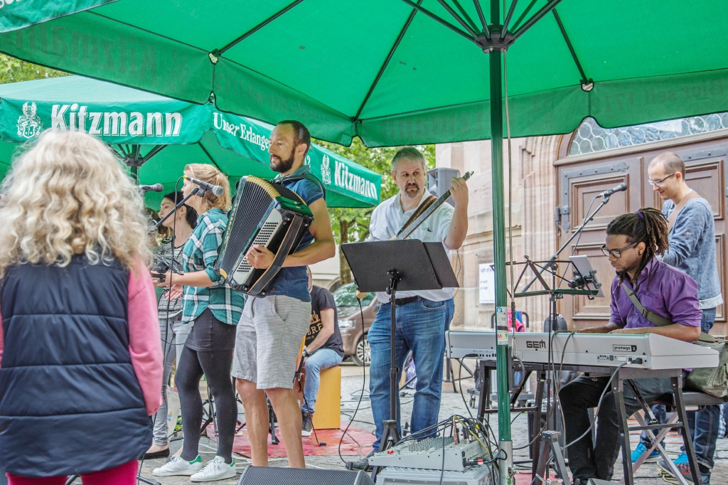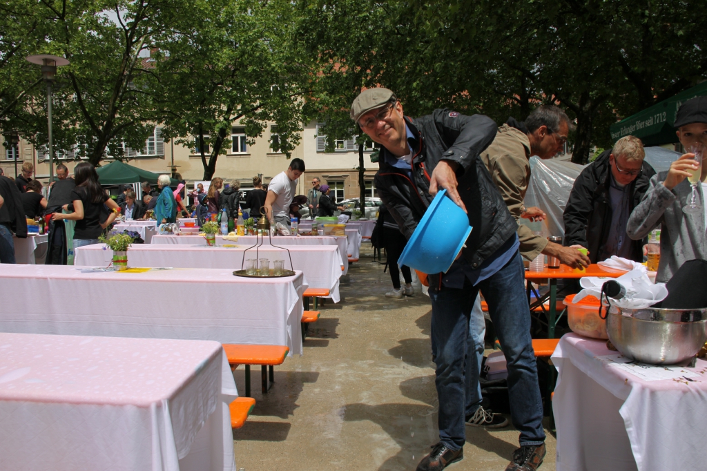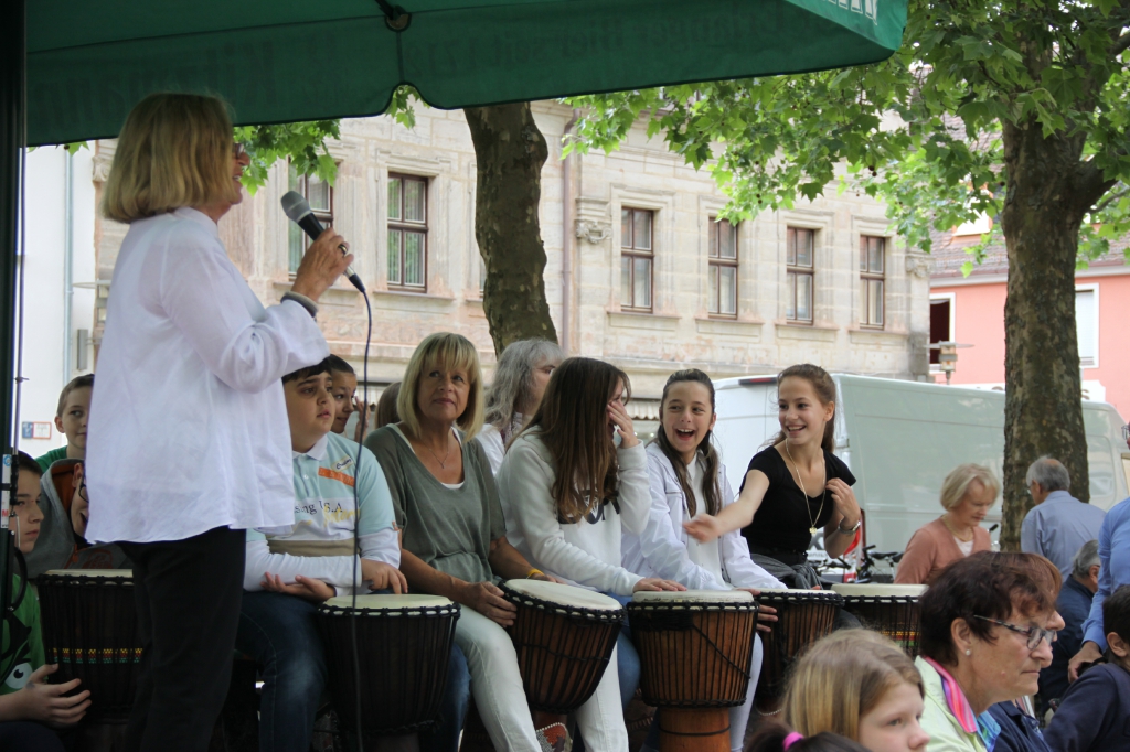 Nach eineinhalb Stunden Sonnenschein hat uns die erste Wolke heimgesucht. Die Trommelpower-Kinder der Hedenus-Mittelschule hatten gerade mit ihrem Auftritt begonnen, als die immer stärker trommelnden Regentropfen sie zum Abbruch zwangen. Dank „wasserfester“ musikalischer Unterhaltung durch die Flüchtlingsband „Miasin zam“ und Gitarrist Felix Käppner mit Band ließen sich aber zahlreiche Gäste auch durch einige weitere Schauer die Stimmung nicht trüben.