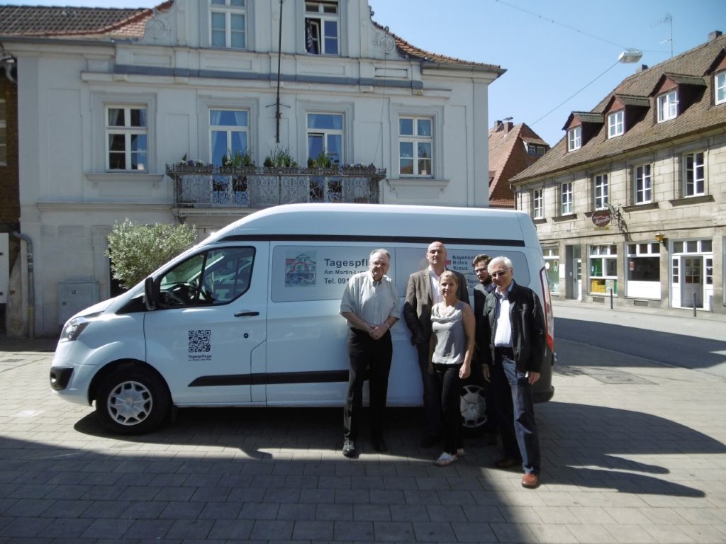Einen lange gehegten Wunsch konnte sich der Verein Tagespflege am Martin-Luther-Platz dieser Tage erfüllen: Er konnte einen Kleinbus in Dienst stellen, mit dem die Tagespatienten, die über kein geeignetes Fahrzeug verfügen, zur Pflegestation und zurück nach Hause gebracht werden können. Die Bürgerstiftung, die schon seit langem die segensreichen Leistungen der Organisation fördert, hat – unterstützt von der Siemens AG – die Anschaffung des behindertengerechten Fahrzeuges durch eine namhafte Spende ermöglicht. Der Vorstandsvorsitzende unserer Stiftung, Martin Böller (rechts im Bild) ließ es sich nicht nehmen, der offiziellen Übernahme durch den Verein beizuwohnen. Zu erkennen sind außerdem (von links nach rechts) Udo B. Greiner (Schirmherr), Heiko Primas (2. Vorsitzender des Vereins), Kristin Kalden (Einrichtungsleiterin) und Jens Schäfer (Fahrdienstleiter des BRK, das die Einsatzfahrer stellt).